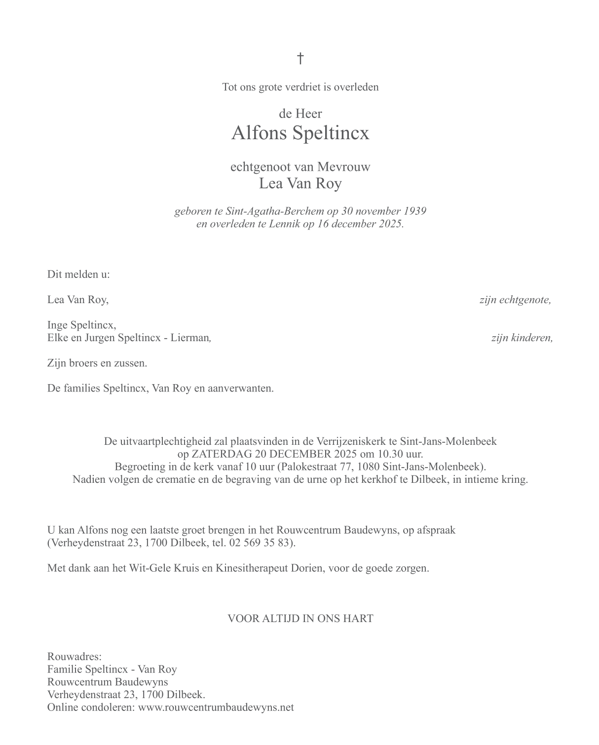 Fallecido en Sint-Martens-Lennik (1750) el martes, 16 de diciembre de 2025 a la edad de 86 años