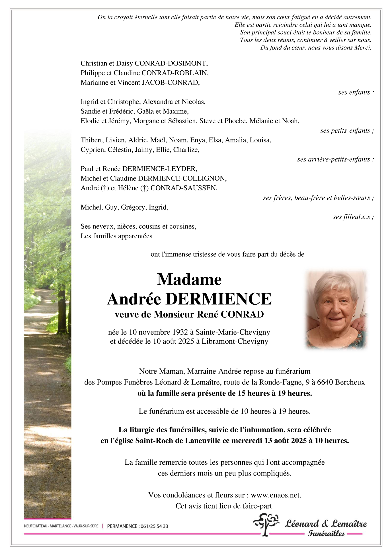 Décédée à Libramont-Chevigny (6800) le dimanche 10 août 2025 à l'âge de 92 ans