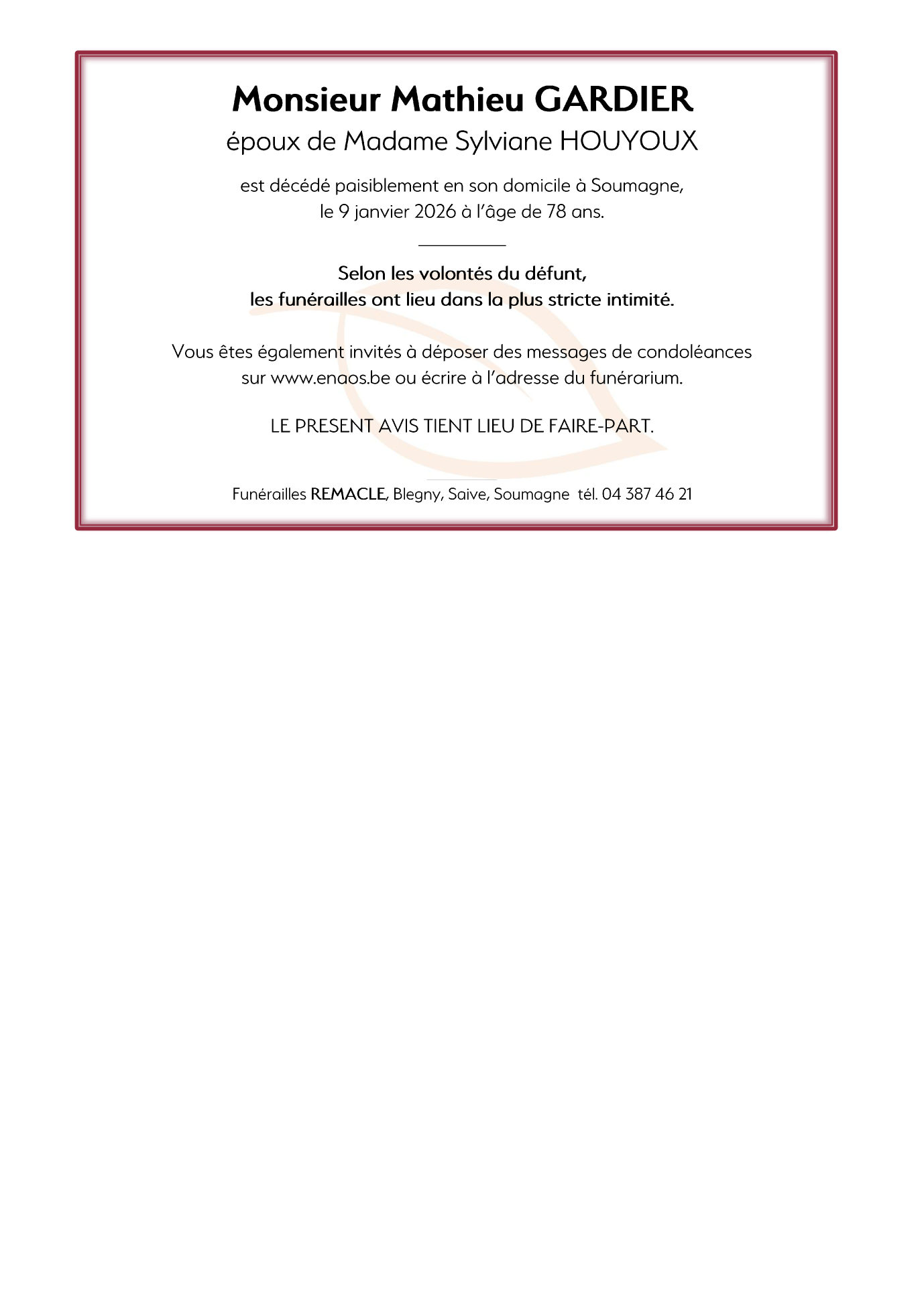 Décédé à Soumagne (4630) le vendredi 9 janvier 2026 à l'âge de 78 ans