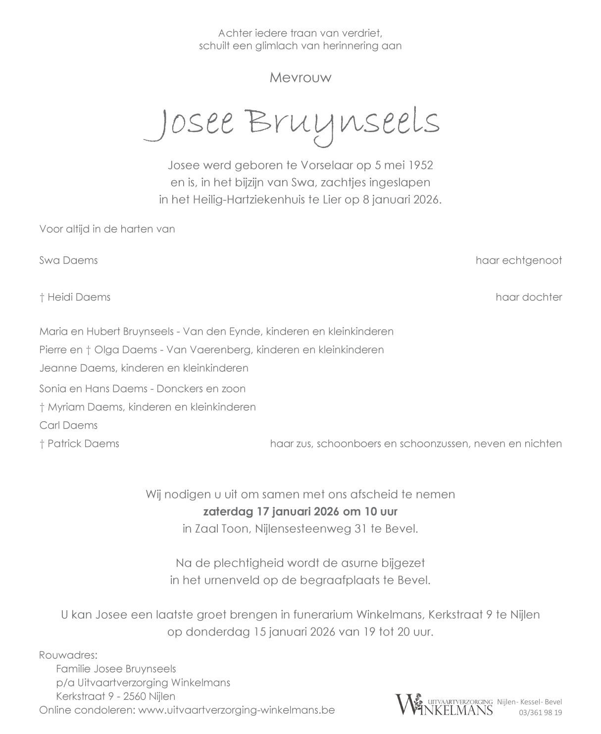 Décédée à Lier (2500) le jeudi 8 janvier 2026 à l'âge de 73 ans