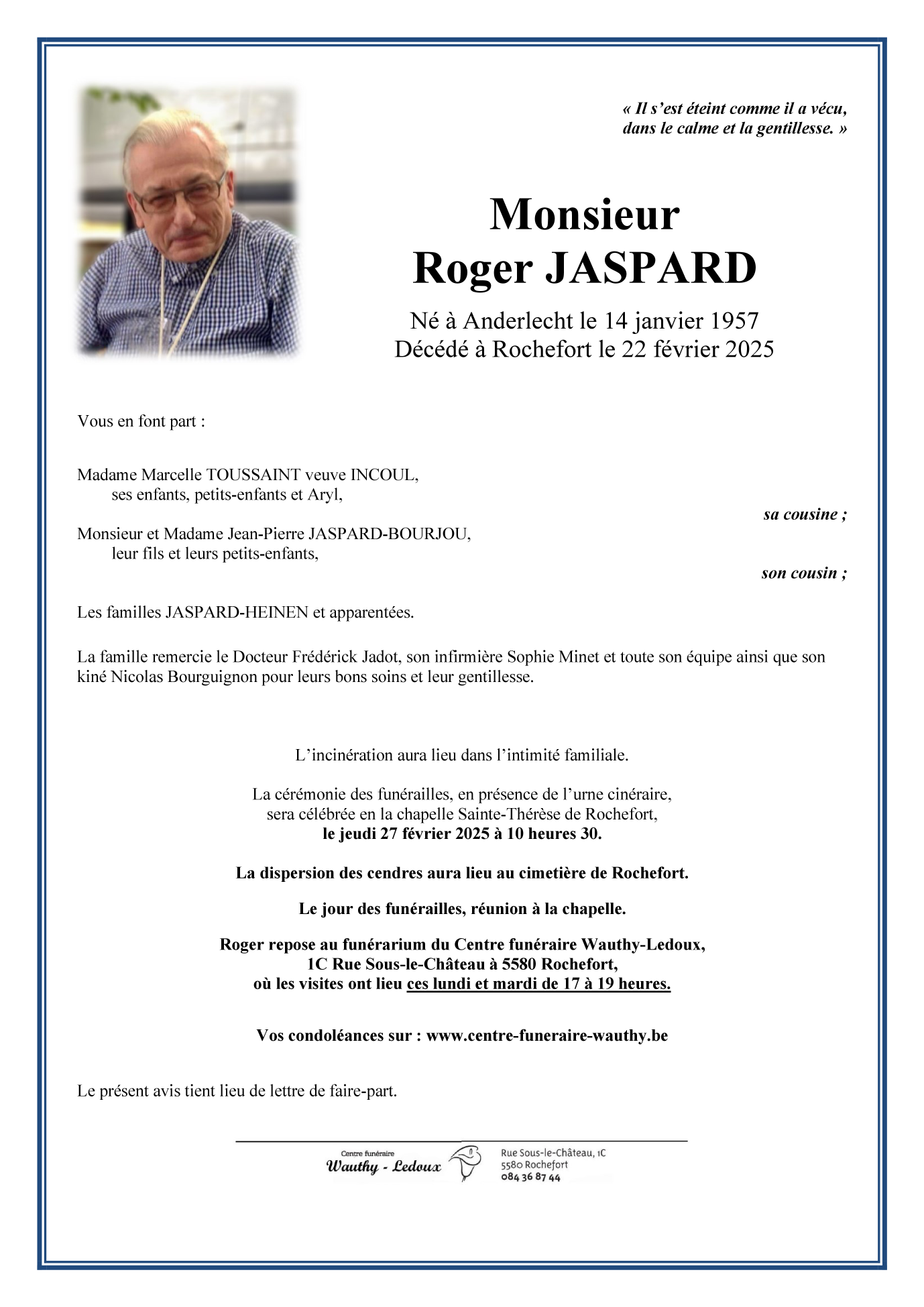 Décédé à Rochefort (5580) le samedi 22 février 2025 à l'âge de 68 ans