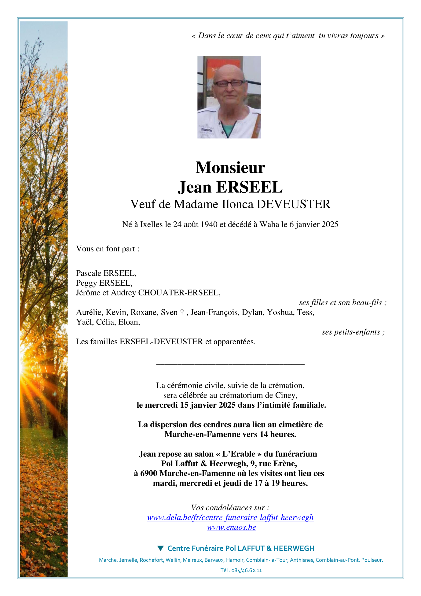 Décédé à Waha (6900) le lundi 6 janvier 2025 à l'âge de 84 ans