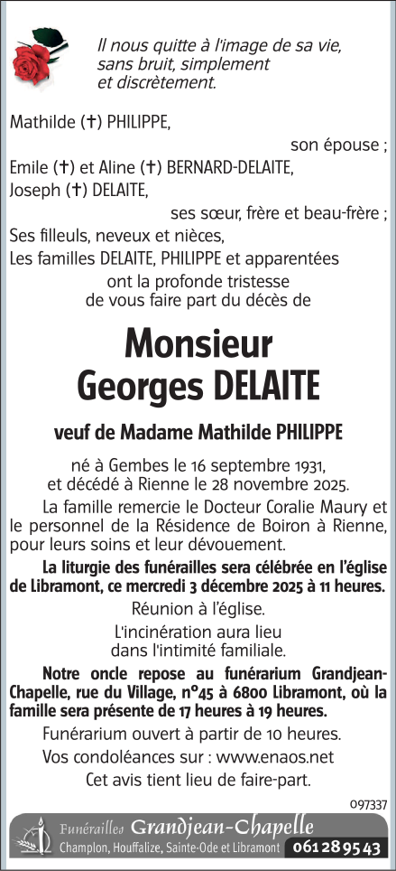 Décédé à Rienne (5575) le vendredi 28 novembre 2025 à l'âge de 94 ans