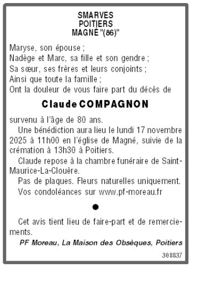 Décédé à Poitiers (86000, France) le mercredi 12 novembre 2025 à l'âge de 80 ans