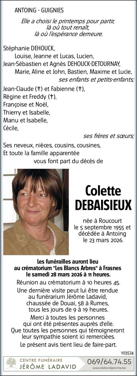 Décédée à Antoing (7640) le lundi 23 mars 2026 à l'âge de 70 ans