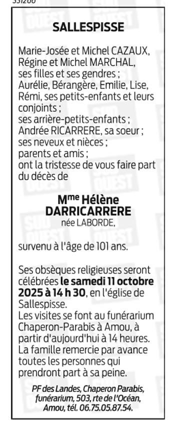 Overleden te Pomarez (40360, Frankrijk) op woensdag 8 oktober 2025 op 101-jarige leeftijd