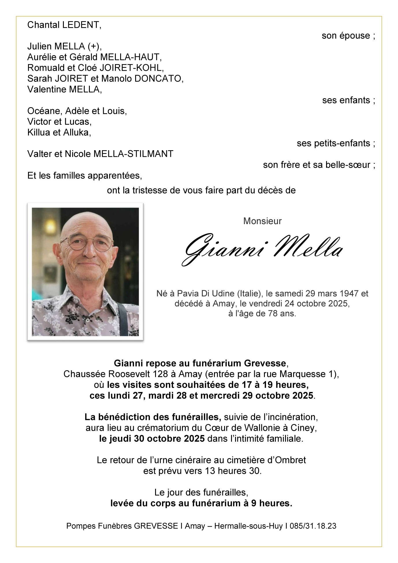 Décédé à Amay (4540) le vendredi 24 octobre 2025 à l'âge de 78 ans