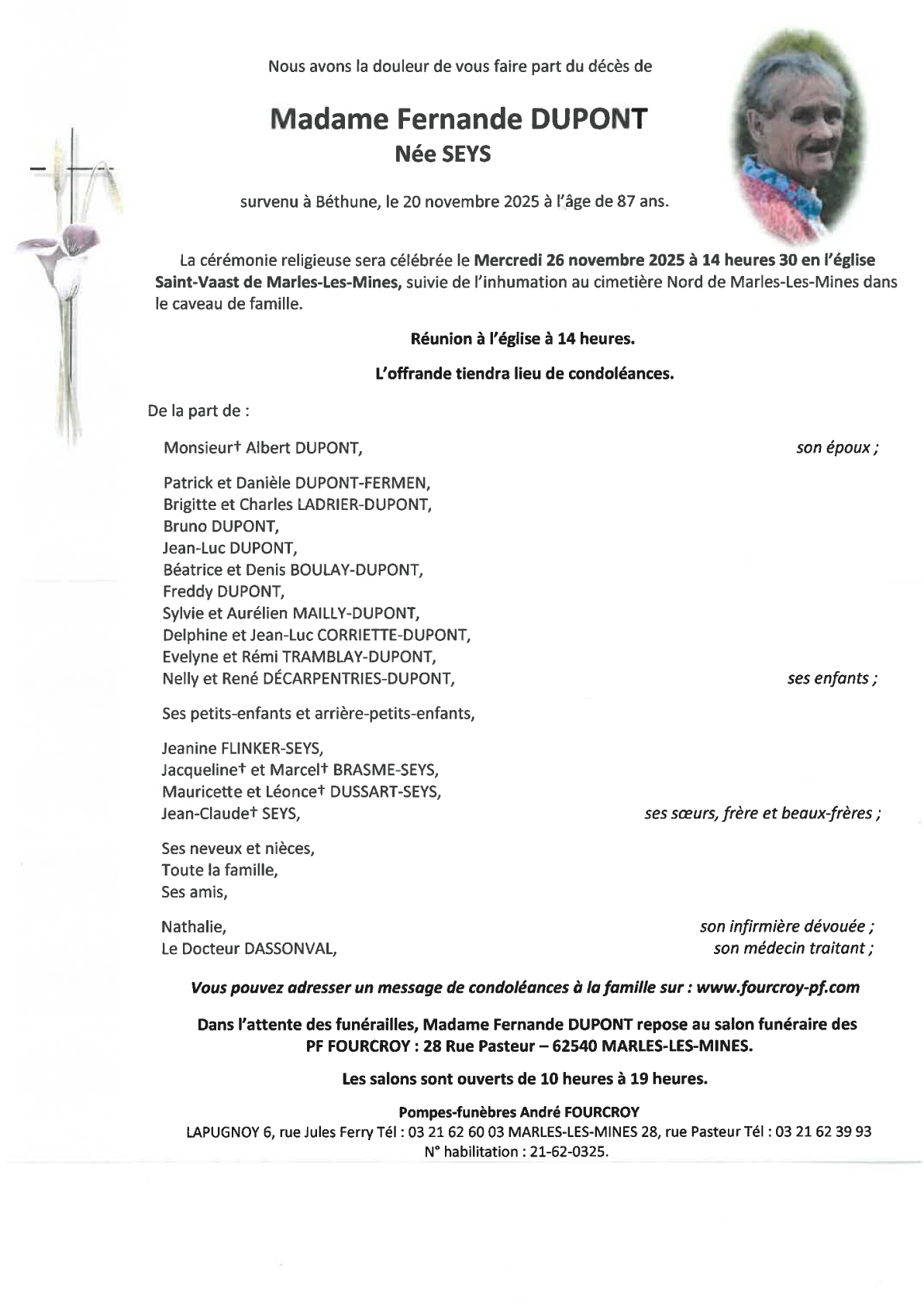 Décédée à Béthune (62400, France) le jeudi 20 novembre 2025 à l'âge de 87 ans