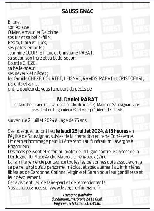 Décédé à Saussignac (24240, France) le dimanche 21 juillet 2024 à l'âge de 75 ans