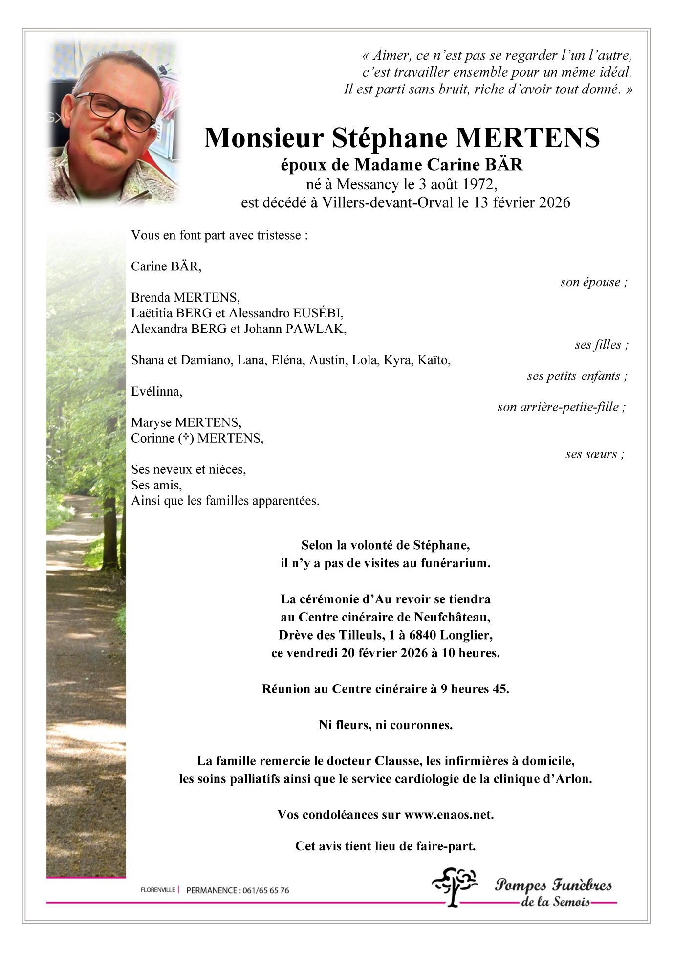 Décédé à Villers-Devant-Orval (6823) le vendredi 13 février 2026 à l'âge de 53 ans