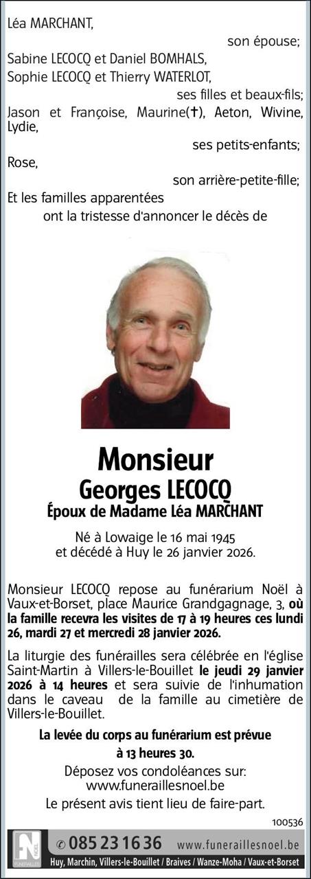 Décédé à Huy (4500) le lundi 26 janvier 2026 à l'âge de 80 ans