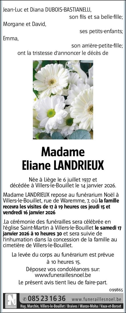 Décédée à Villers-le-Bouillet (4530) le mercredi 14 janvier 2026 à l'âge de 88 ans