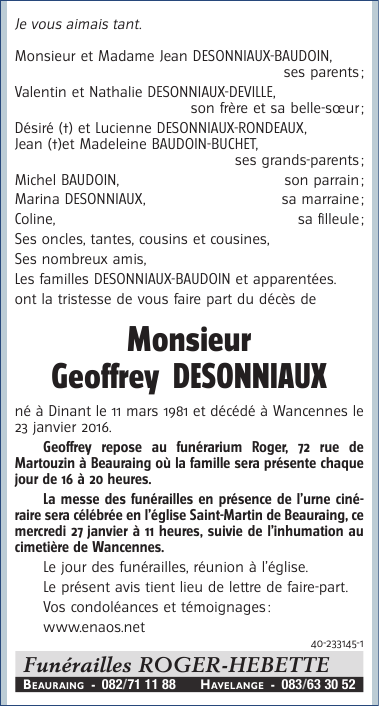 Overleden te Wancennes (5570) op zaterdag 23 januari 2016 op 34-jarige leeftijd