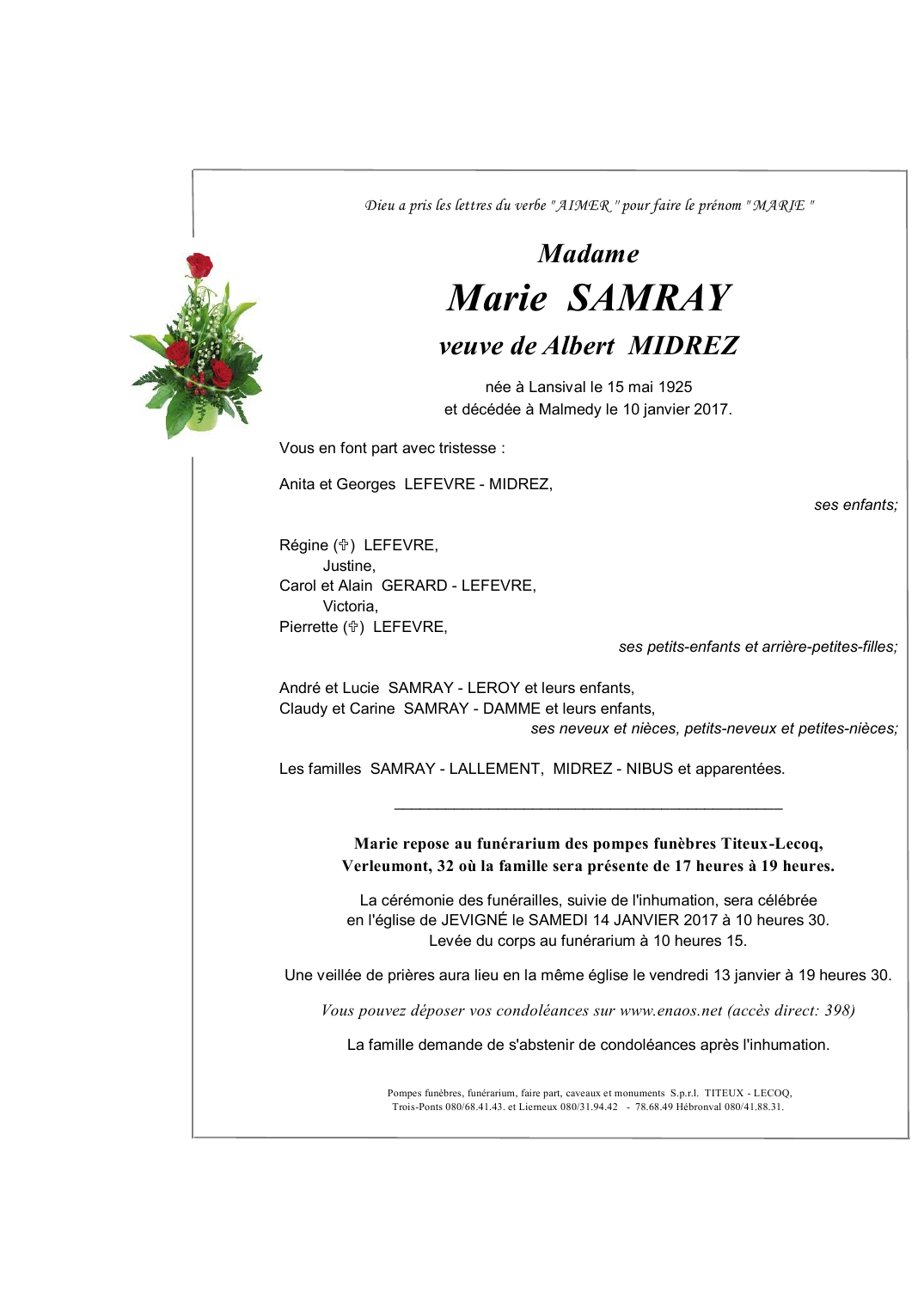 Fallecida en Malmedy (4960) el martes, 10 de enero de 2017 a la edad de 91 años