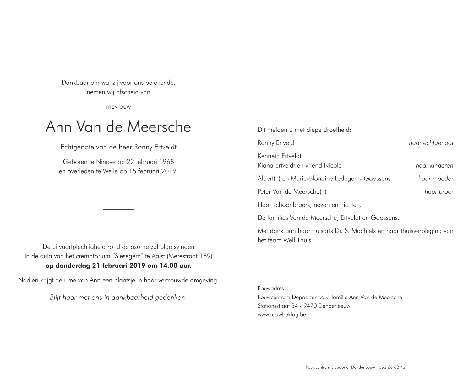 Décédée à Welle (9473) le vendredi 15 février 2019 à l'âge de 50 ans