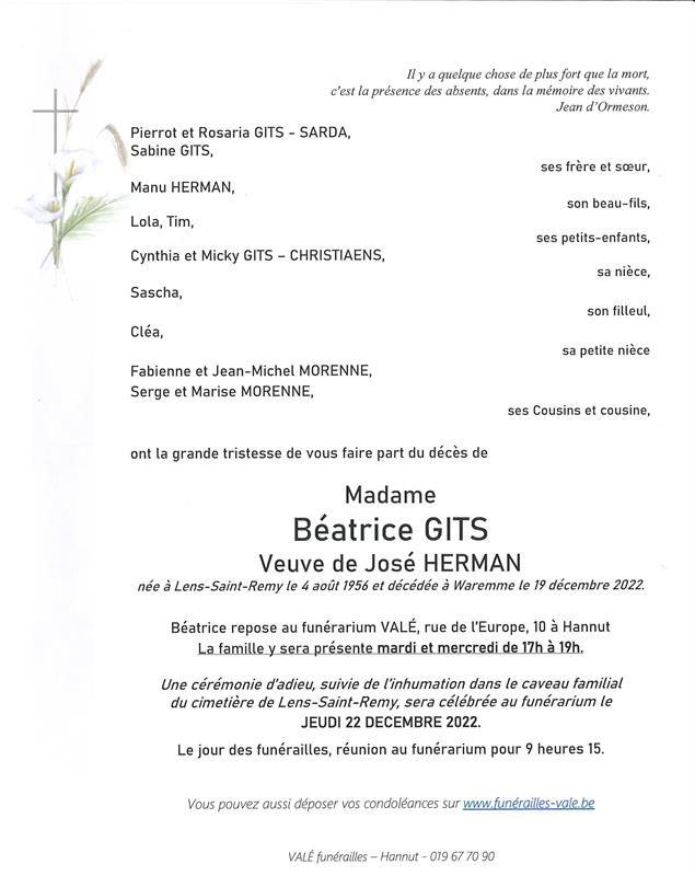 Décédée à Waremme (4300) le lundi 19 décembre 2022 à l'âge de 66 ans