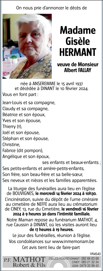 Décédée à Dinant (5500) le samedi 10 février 2024 à l'âge de 86 ans