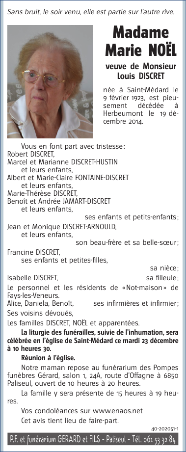 Overleden te Herbeumont (6887) op vrijdag 19 december 2014 op 91-jarige leeftijd