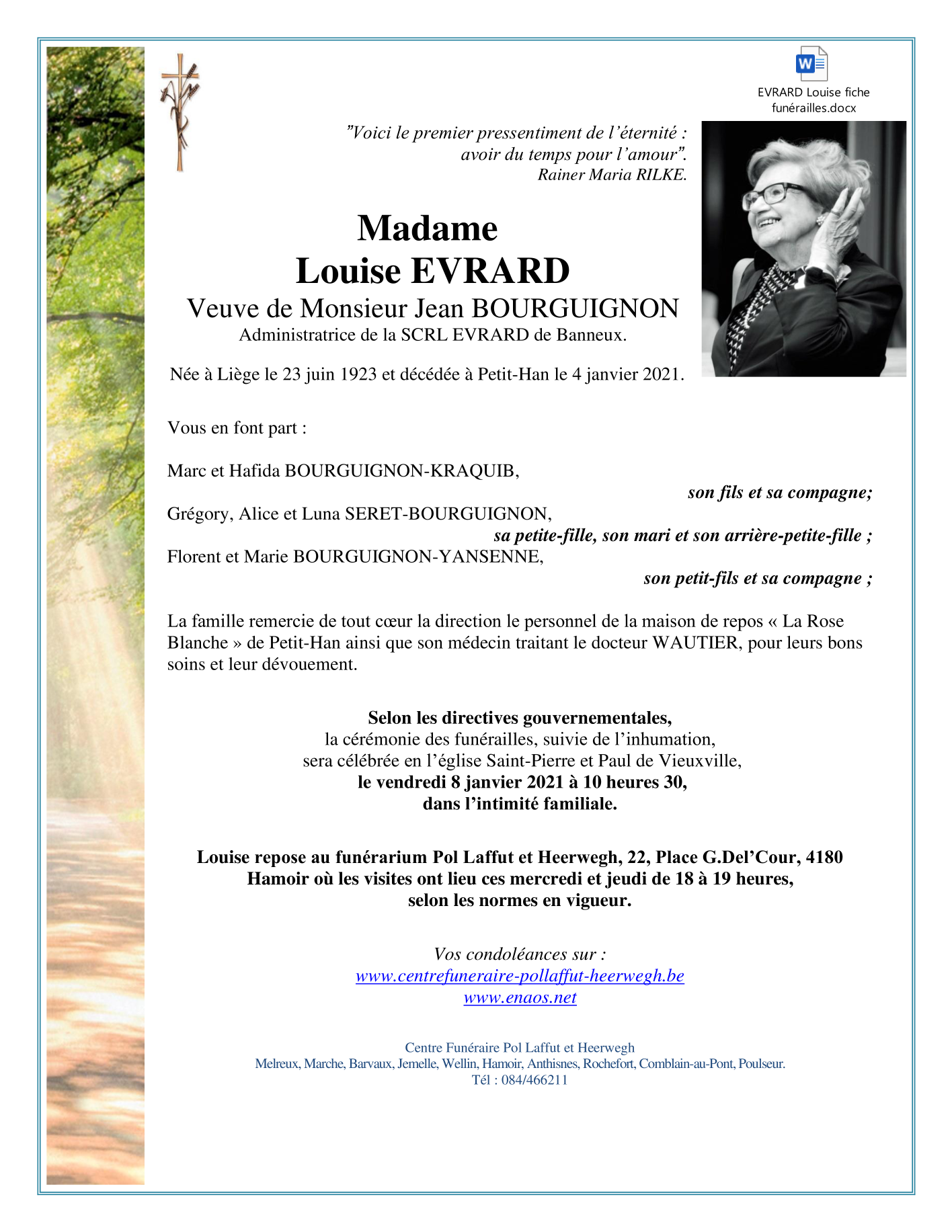 Décédée à Petit-Han (6940) le mardi 5 janvier 2021 à l'âge de 97 ans
