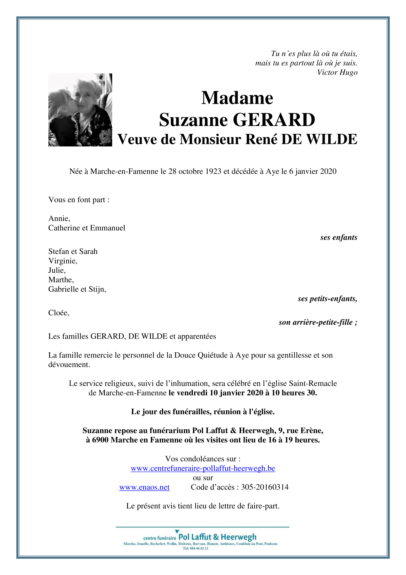 Décédée à Aye (6900) le lundi 6 janvier 2020 à l'âge de 96 ans