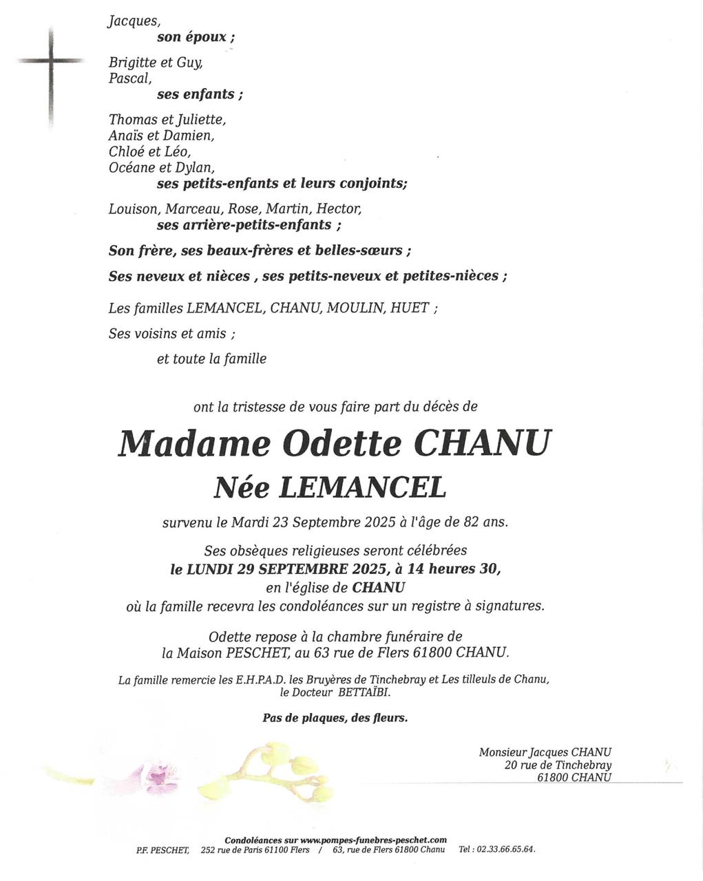 Décédée à Chanu (61800, France) le mardi 23 septembre 2025 à l'âge de 82 ans