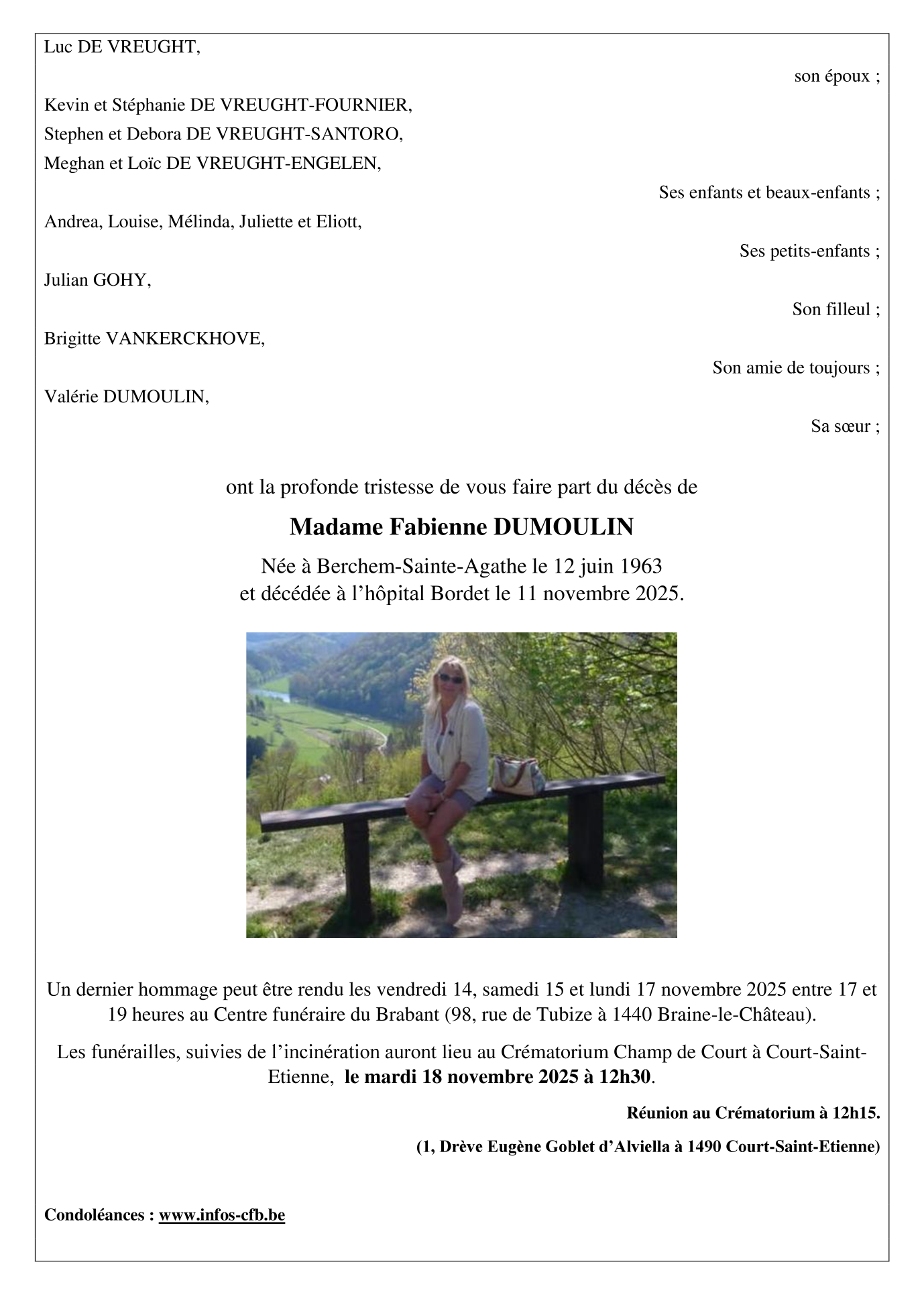 Décédée à Anderlecht (1070) le mardi 11 novembre 2025 à l'âge de 62 ans