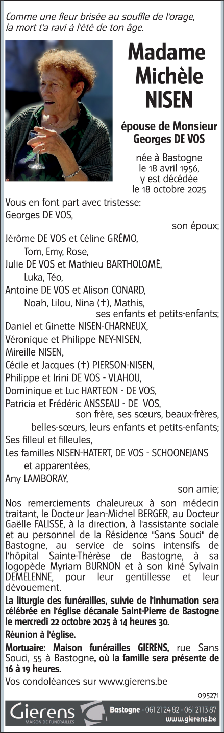 Overleden te Bastogne (6600) op zaterdag 18 oktober 2025 op 69-jarige leeftijd