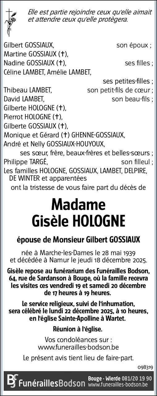Décédée à Namur (5000) le jeudi 18 décembre 2025 à l'âge de 86 ans