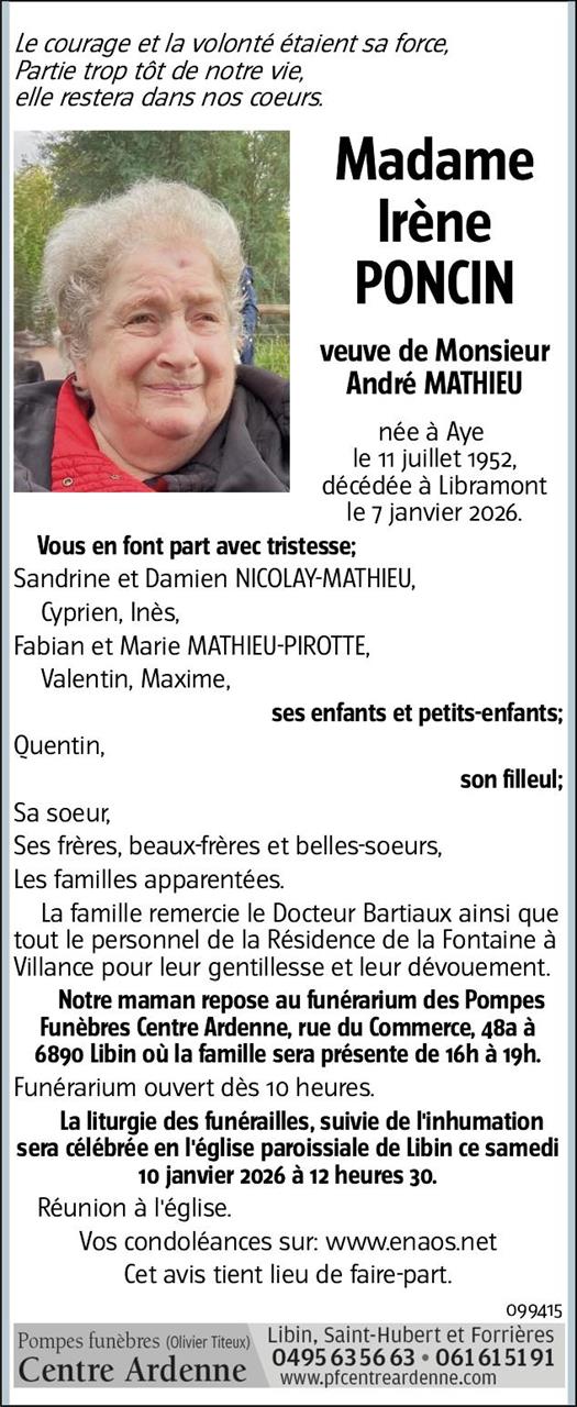 Décédée à Libramont-Chevigny (6800) le mercredi 7 janvier 2026 à l'âge de 73 ans