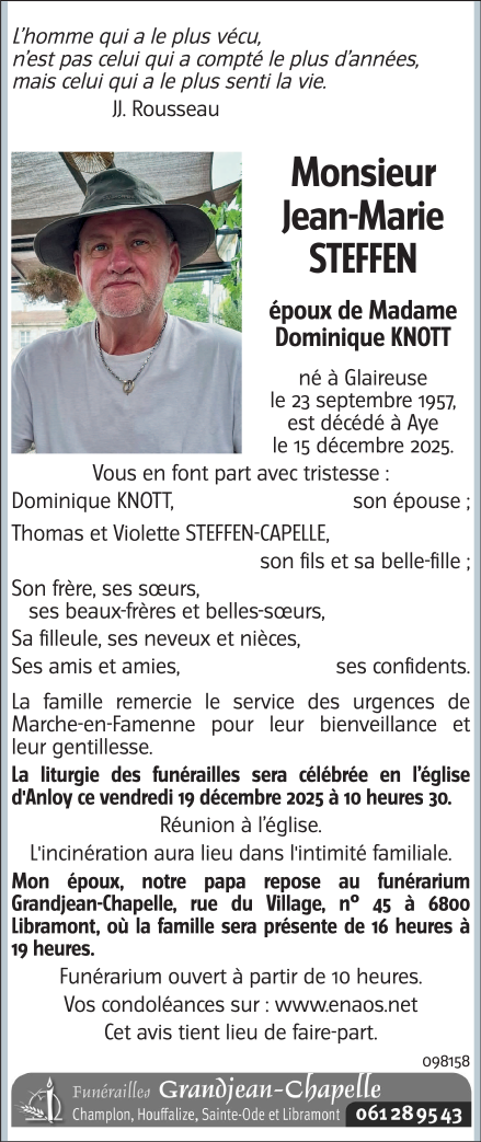 Died in Aye (6900) on 15 December 2025 at the age of 68 years