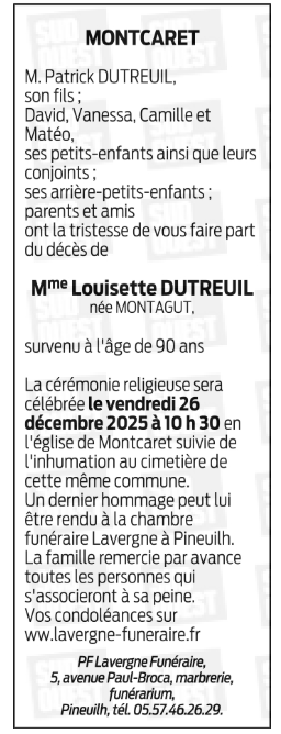 Fallecida en Sainte-Foy-la-Grande (33220, Francia) el viernes, 19 de diciembre de 2025 a la edad de 90 años