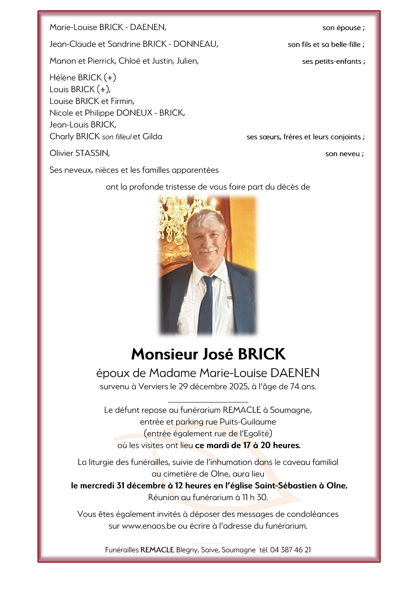 Décédé à Verviers (4800) le lundi 29 décembre 2025 à l'âge de 74 ans
