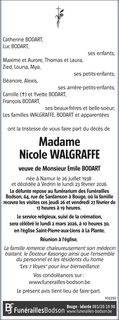 Décédée à Vedrin (5020) le lundi 23 février 2026 à l'âge de 87 ans