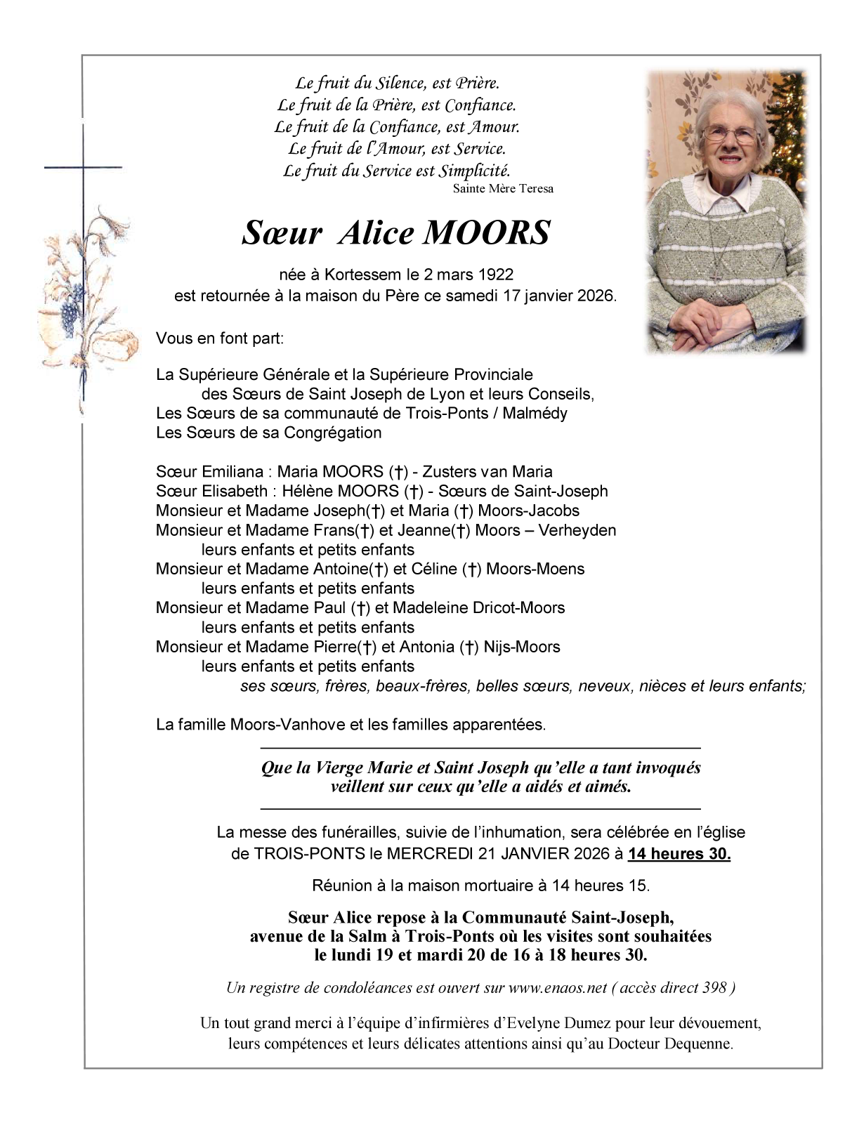 Décédée à Trois-Ponts (4980) le samedi 17 janvier 2026 à l'âge de 103 ans