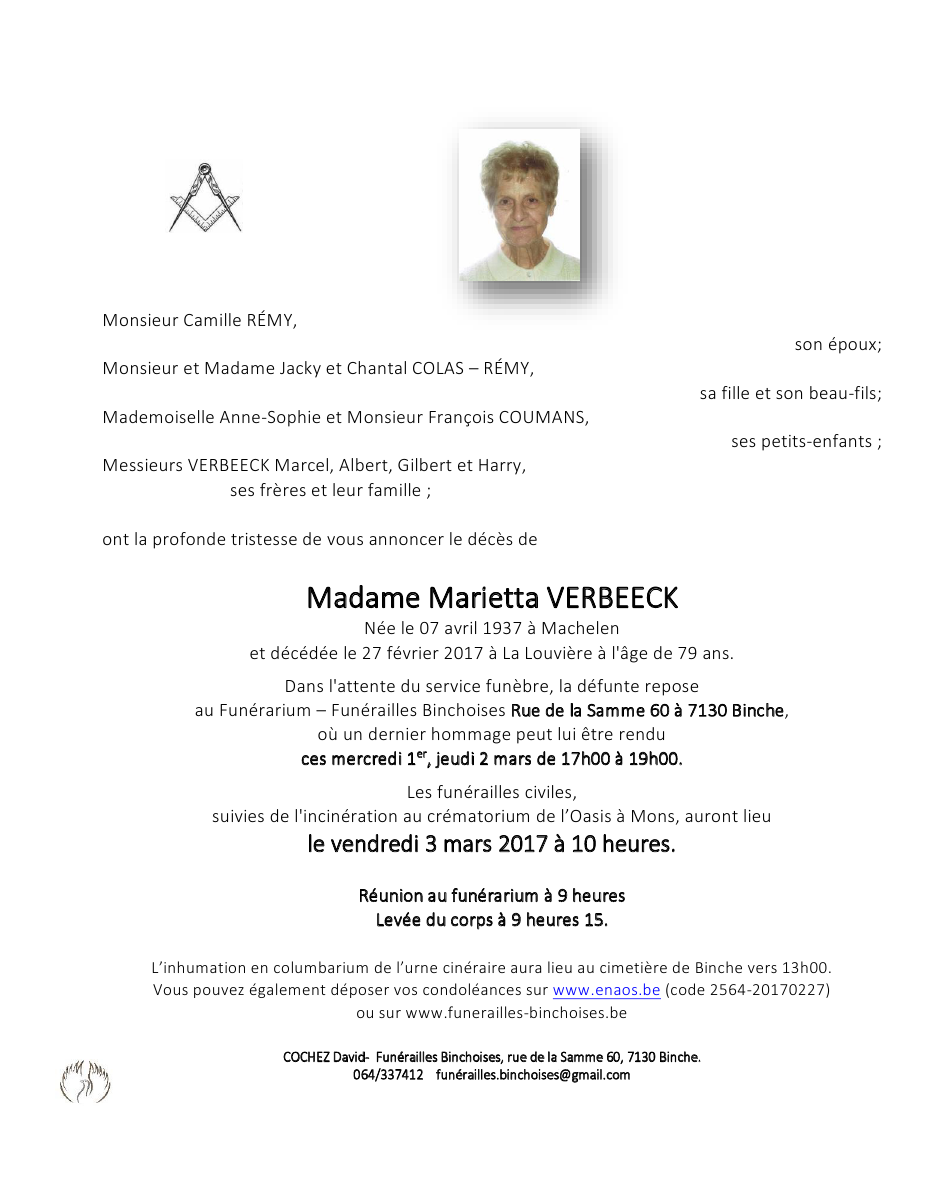 Fallecida en La Louvière (7100) el lunes, 27 de febrero de 2017 a la edad de 79 años