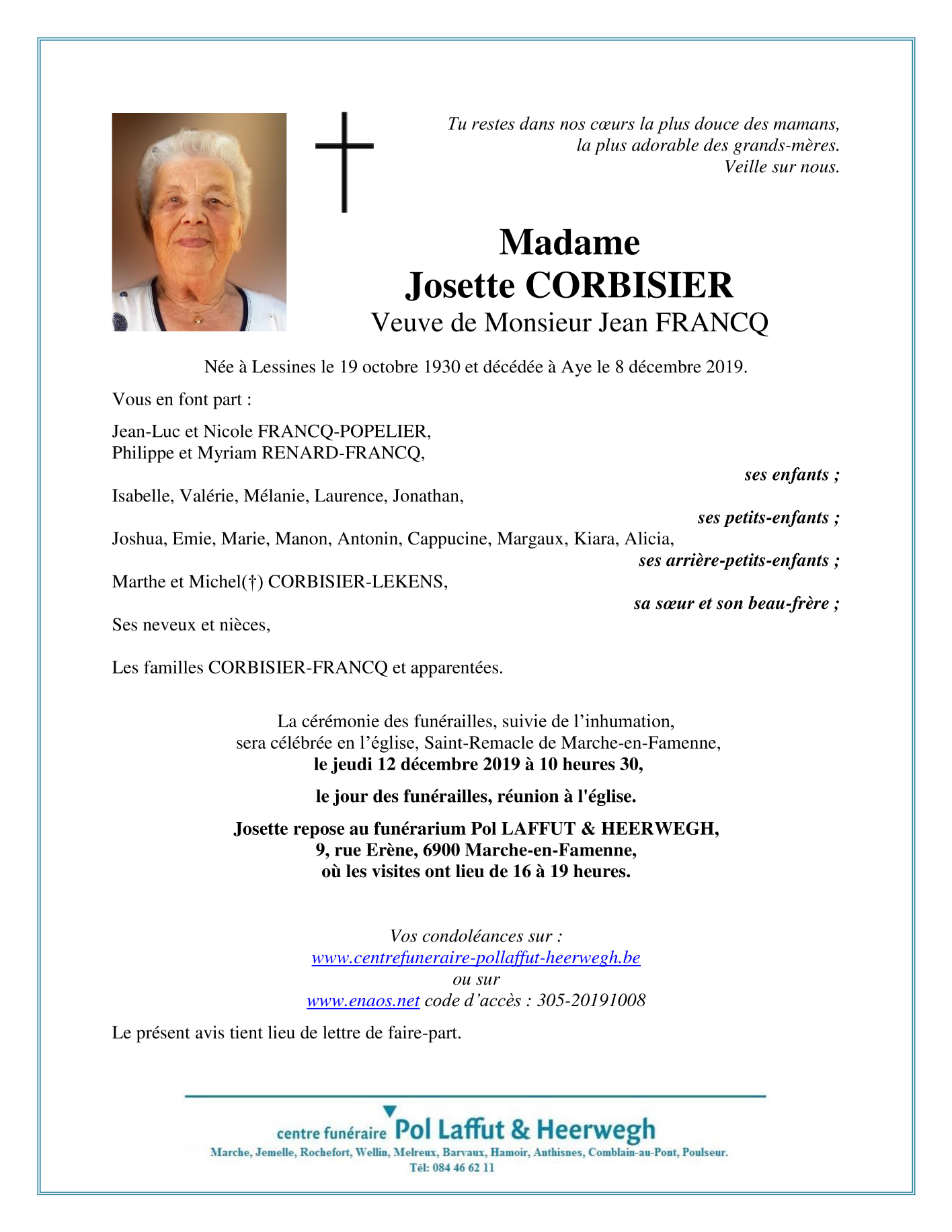 Décédée à Aye (6900) le dimanche 8 décembre 2019 à l'âge de 89 ans