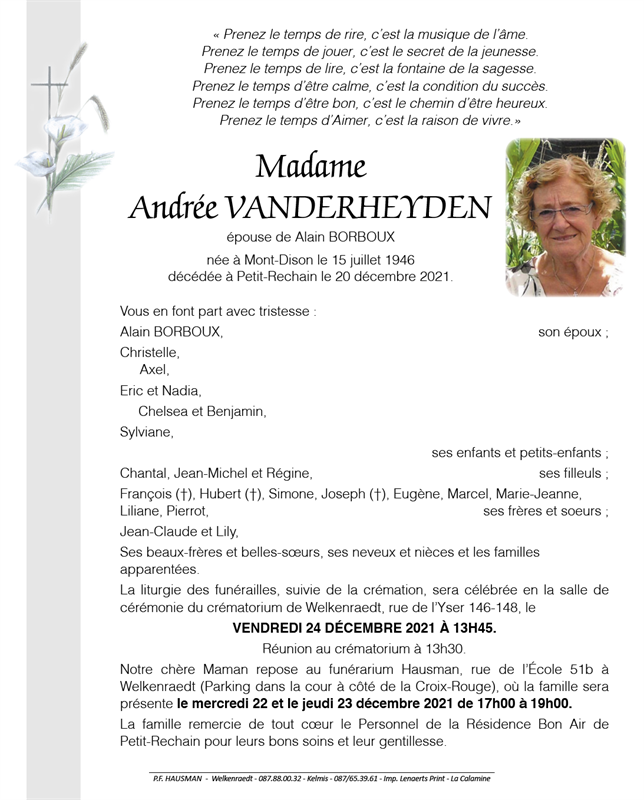 Died in Petit-Rechain (4800) on 20 December 2021 at the age of 75 years