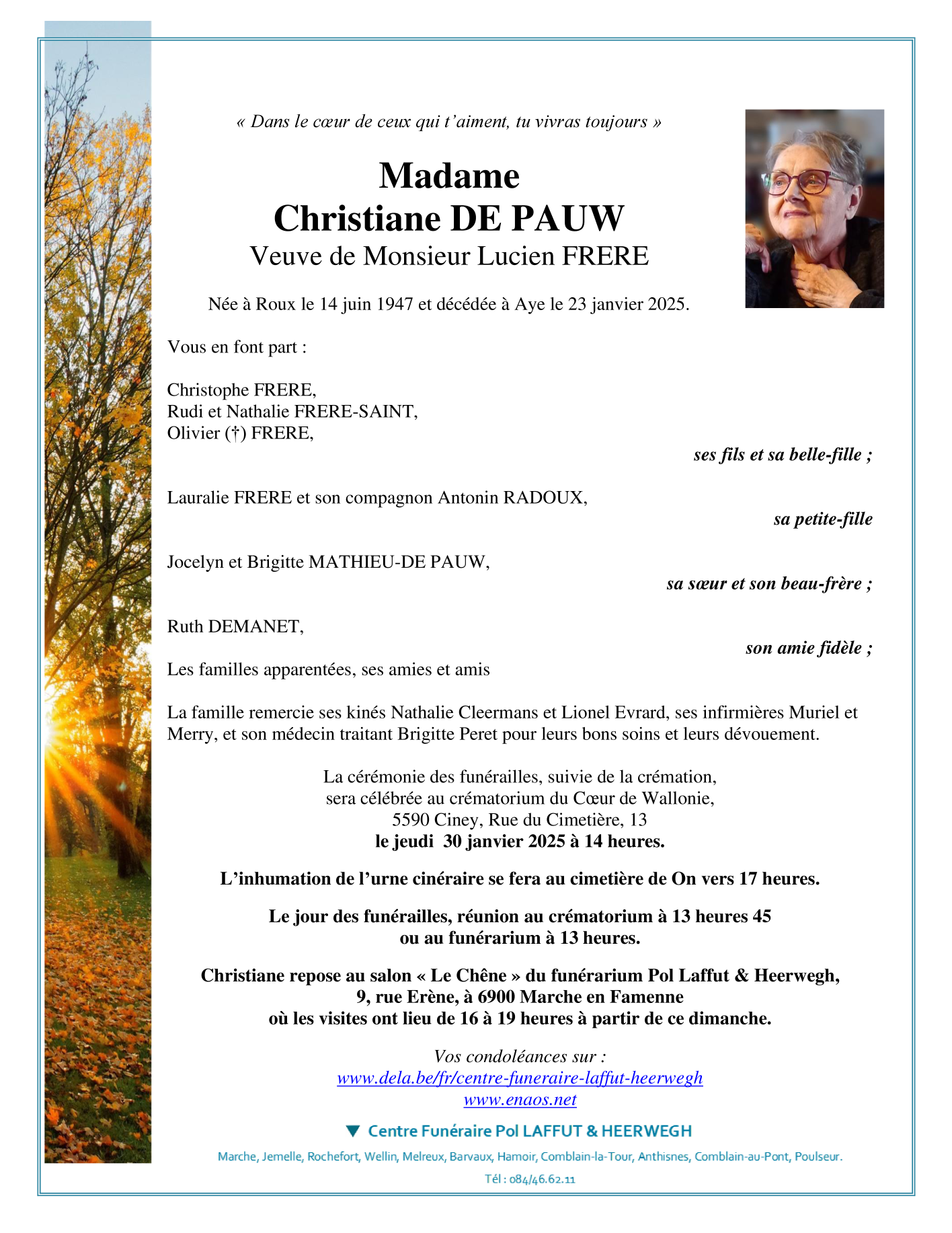 Décédée à Aye (6900) le jeudi 23 janvier 2025 à l'âge de 77 ans