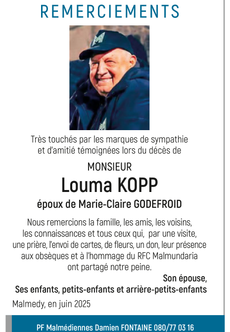 Died in Malmedy (4960) on 13 June 2025 at the age of 76 years