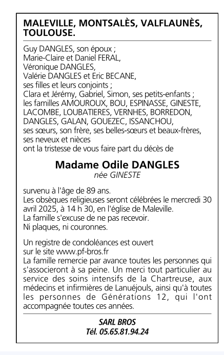 Décédée à Villefranche-de-Rouergue (12200, France) le vendredi 25 avril 2025 à l'âge de 89 ans