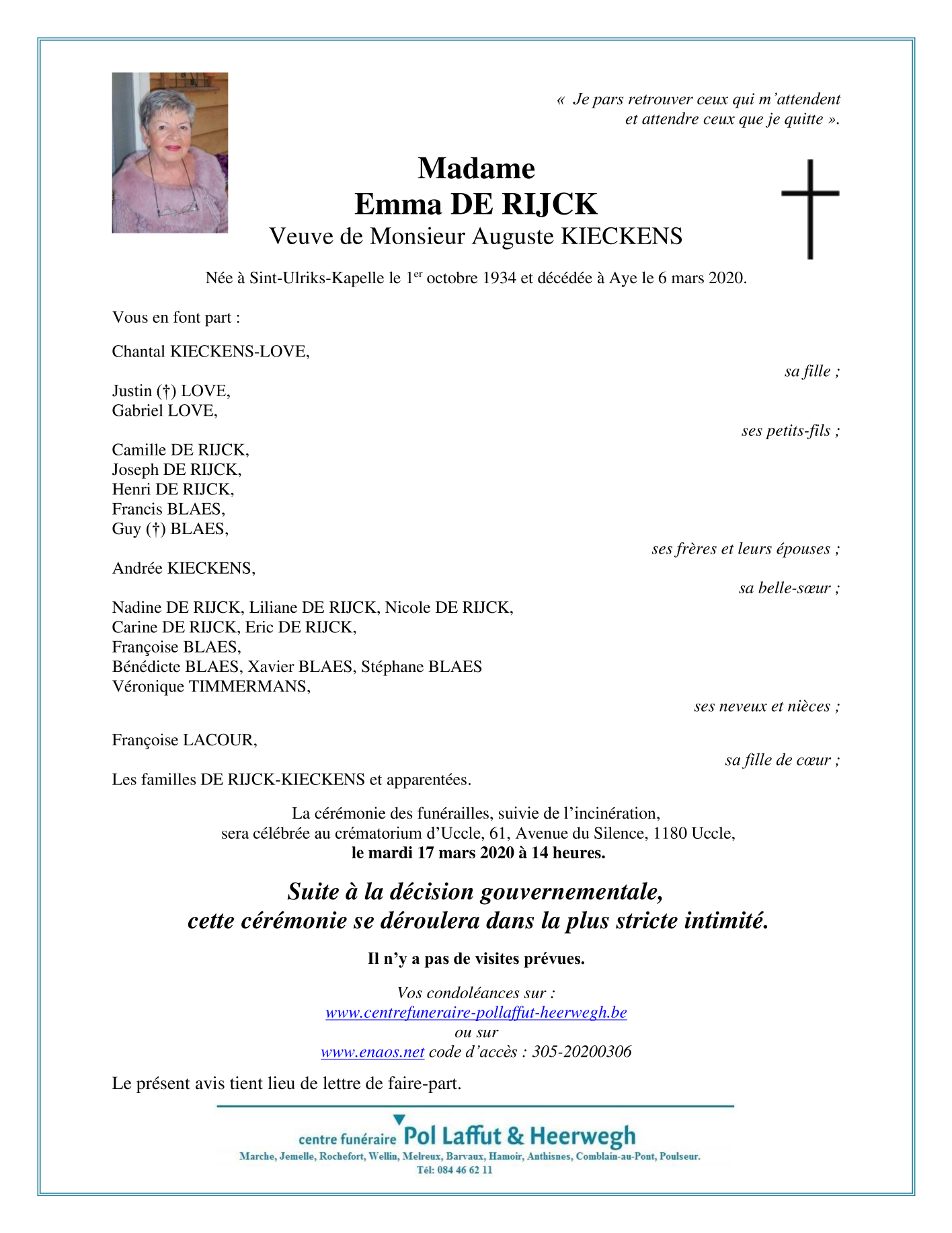 Overleden te Aye (6900) op vrijdag 6 maart 2020 op 85-jarige leeftijd