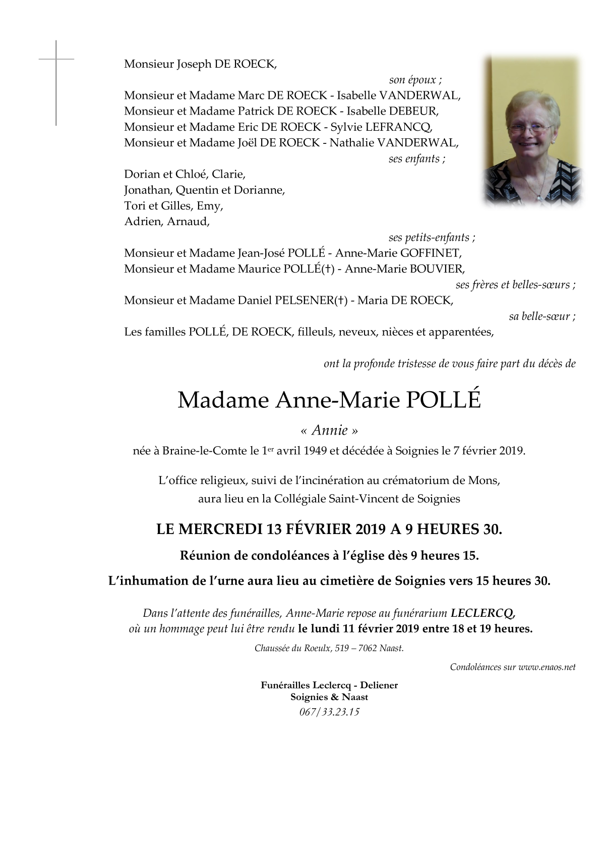 Overleden te Soignies (7060) op donderdag 7 februari 2019 op 69-jarige leeftijd