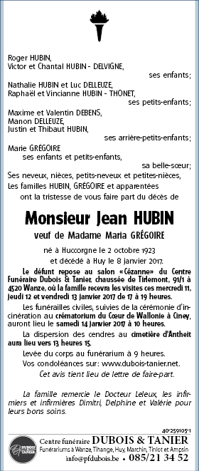 Décédé à Huy (4500) le dimanche 8 janvier 2017 à l'âge de 93 ans
