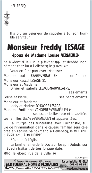 Décédé à Hellebecq (7830) le mardi 3 avril 2018 à l'âge de 82 ans