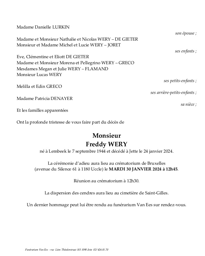 Décédé à Bruxelles (Jette) (1090) le mercredi 24 janvier 2024 à l'âge de 79 ans