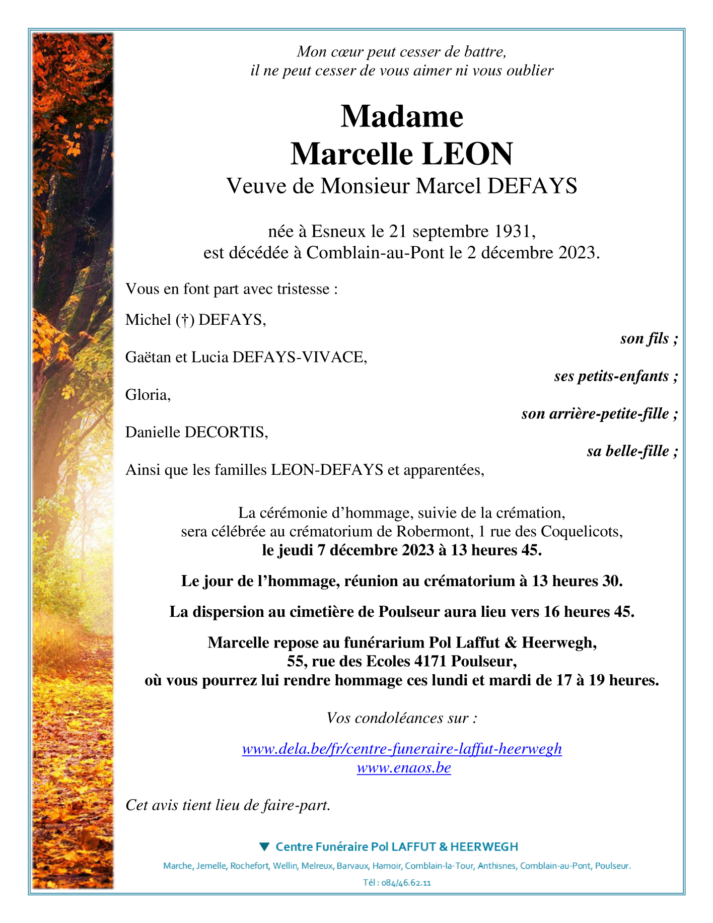 Overleden te Comblain-au-Pont (4170) op zaterdag 2 december 2023 op 92-jarige leeftijd
