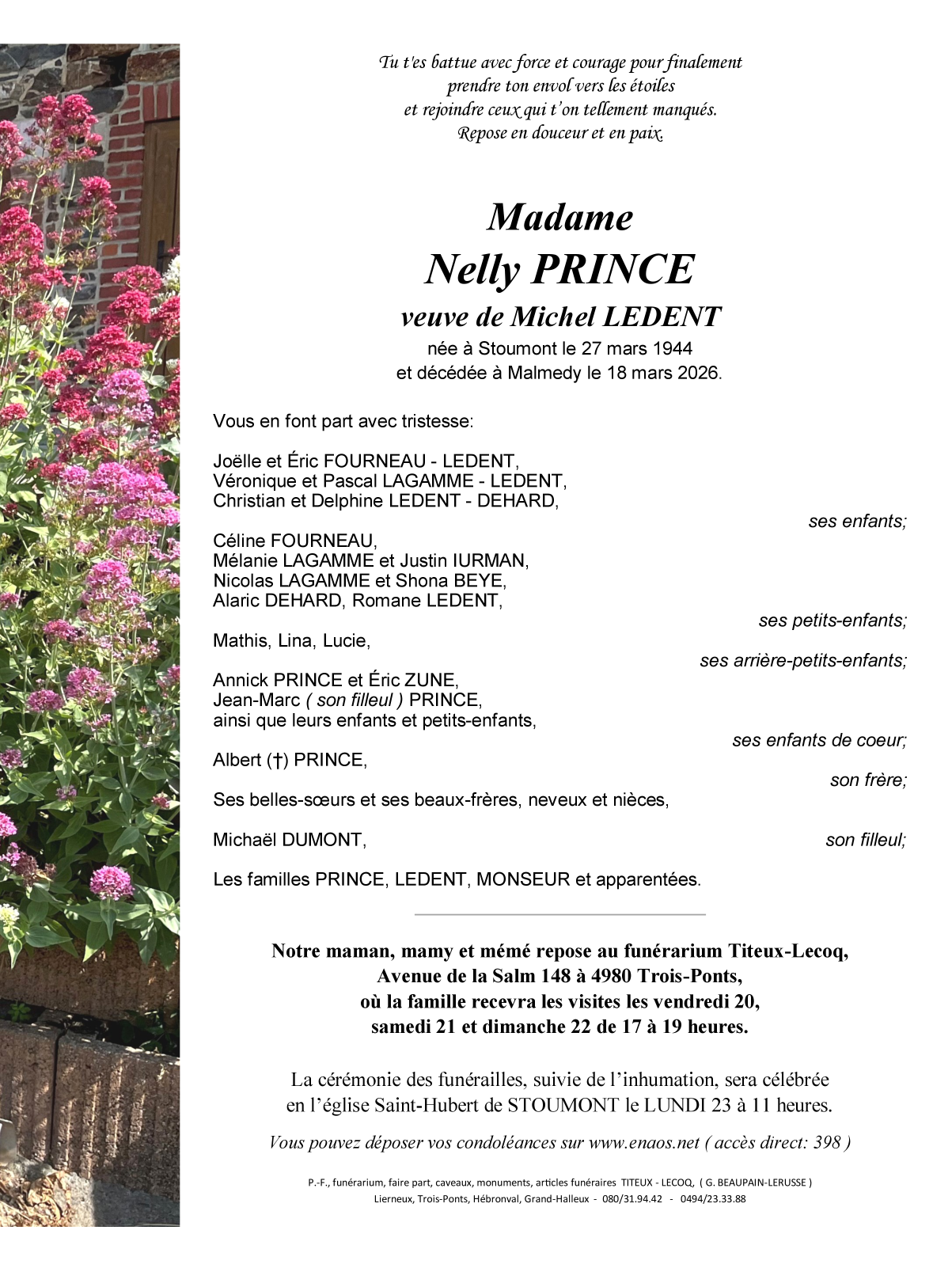 Décédée à Malmedy (4950) le mercredi 18 mars 2026 à l'âge de 81 ans