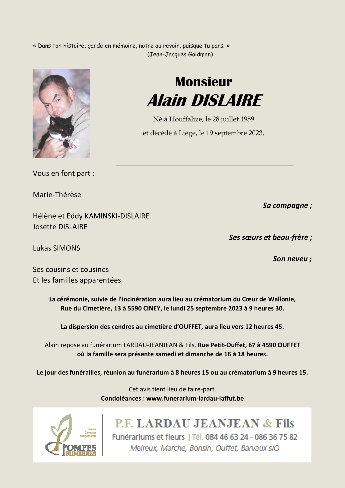 Décédé à Liège (4020) le mardi 19 septembre 2023 à l'âge de 64 ans