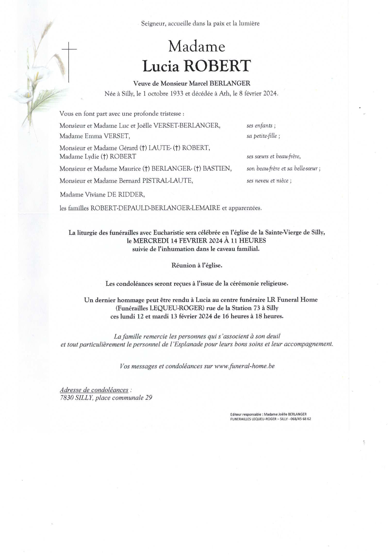 Décédée à Ath (7800) le jeudi 8 février 2024 à l'âge de 91 ans