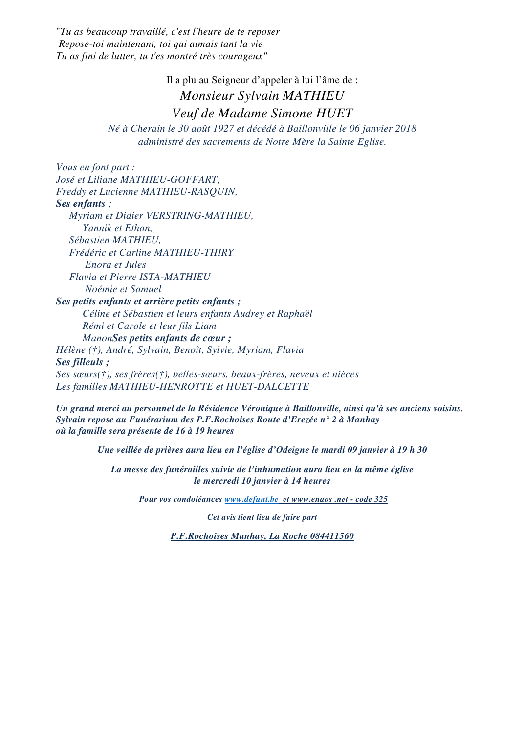 Overleden te Baillonville (5377) op zaterdag 6 januari 2018 op 90-jarige leeftijd